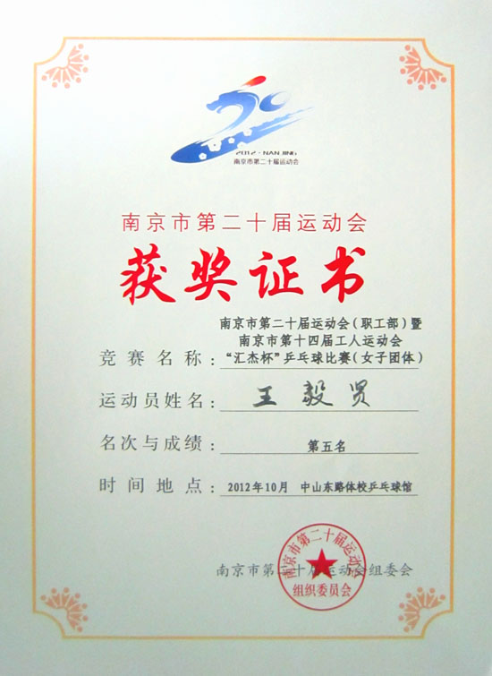 南京市第二十届运动会(职工部)暨南京市第十四届工人运动会乒乓球比赛于10月20日—23日在南京市中山东路体校乒乓球馆进行。我校体育部教师王毅贤代表市教卫系统参加比赛,经过两天半的激烈拼搏,顽强奋战,获得乒乓球女子团体赛第五名的好成绩。充分展示了我校教职工的风采。