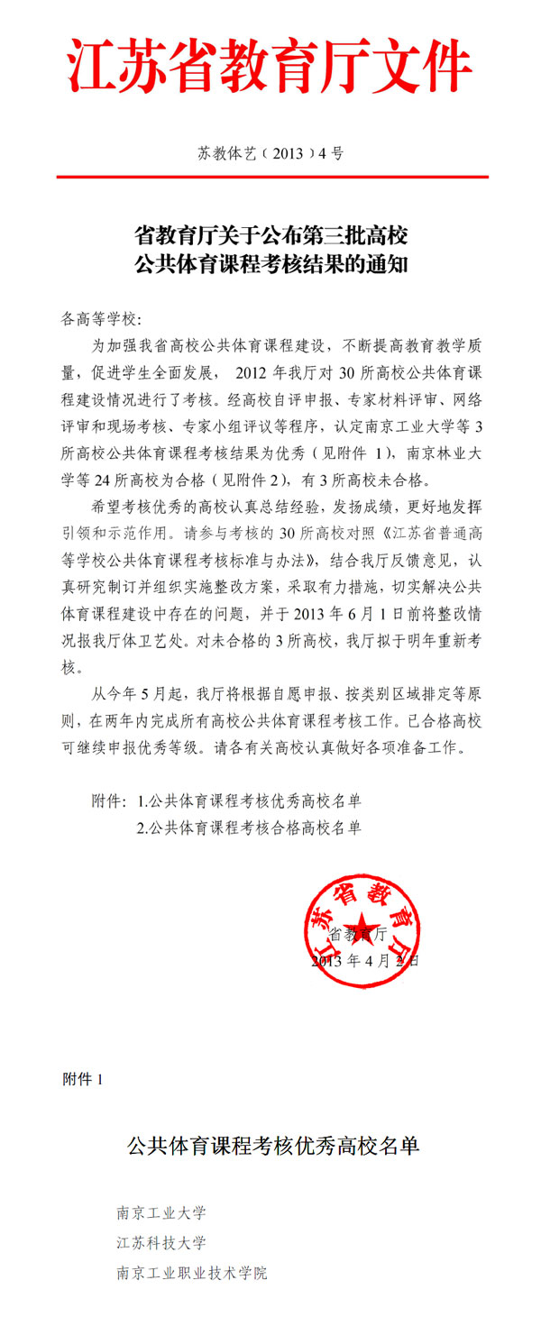 经我校自评申报,专家材料评审,网络评审和现场考核,专家小组评议等程序,其中三所高校公共体育课程考核结果为优秀,我校是唯一一所被评为“江苏省高校公共体育课程考核优秀”的高职院校。