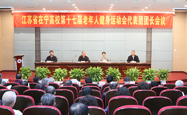10月27日上午,2018年江苏省在宁高校第十七届老年人健身运动会代表团团长会议在我校学术交流中心报告厅召开。在宁高校老体协理事长、常务理事、理事、秘书长、副秘书长;26所在宁高校涉老部门负责同志、代表团团长、老体协秘书长和我校筹委会各工作组负责同志100余人参加了会议。我校党委副书记苏小冬出席会议并致欢迎辞。会议由江苏省在宁高校老体协秘书长胡连城主持。